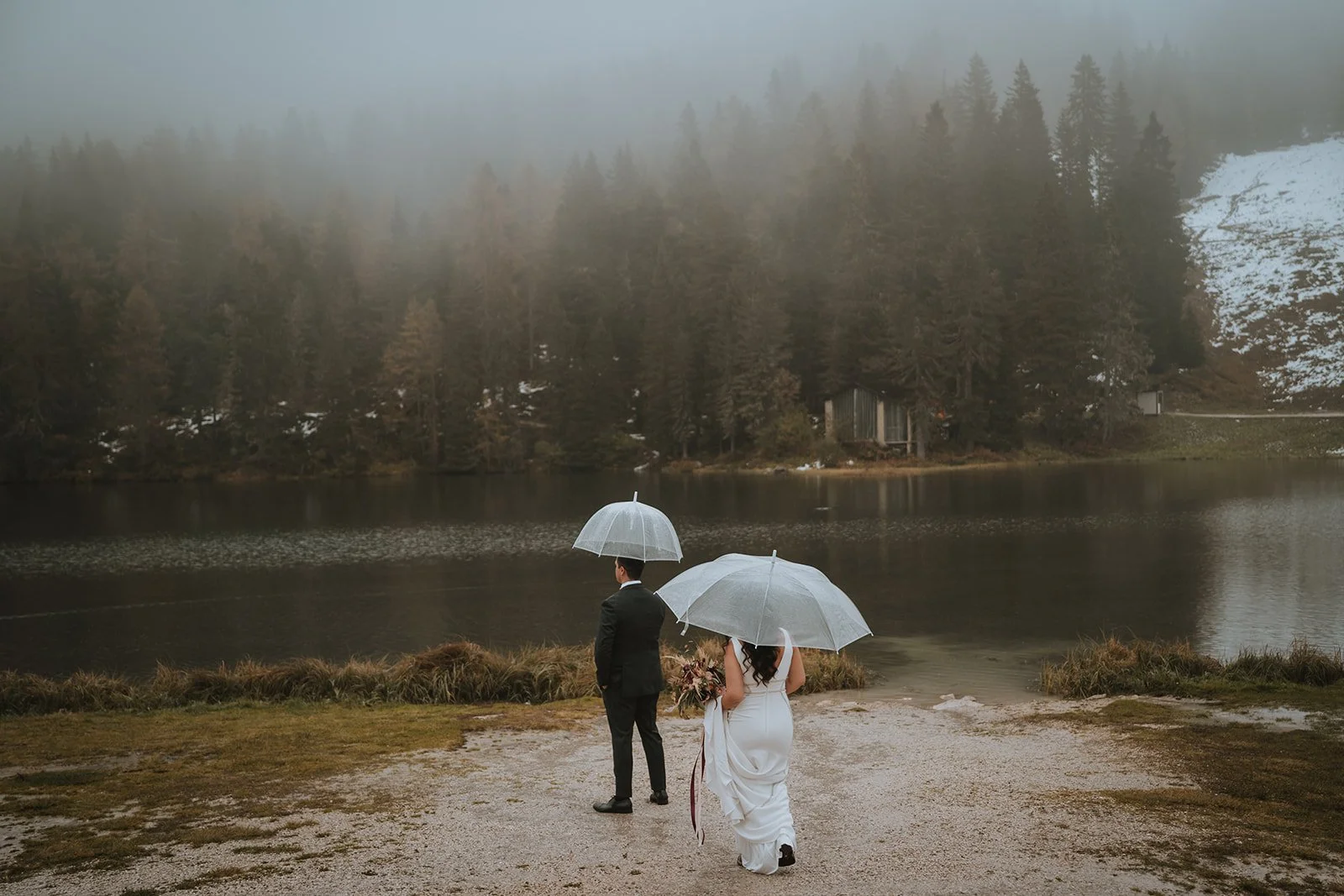 Both of them instantly said that they didn’t mind the rain and still wanted to have the best time ever. That’s why we kept the first part of our plan more or less unchanged. They both got ready separately and T had her hair and make-up done. We only opted for a more relaxed start into the day as it didn’t make any sense to get up for the non-existent sunrise. After both of them prepared themselves for the rain outside and we equipped them with some transparent umbrellas we headed outside to the lake where they had their first look before strolling around the lake. They were just laughing all the time as it apparently is “their thing” that there is always something that goes wrong and they learned to just accept it and not get bothered about it too much.