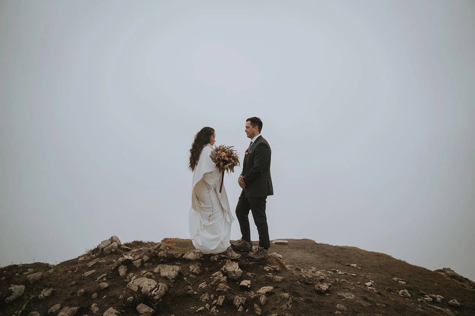 We just wrapped up the first day, when it starting raining again and we drove back to their chalet. When we started the planning process with T&G they said that they still wanted to do a private first dance and that’s exactly what we did when we arrived back at their accommodation. After that we left them to their private dinner before we met the next day. The weather forecast for today said no rain but unfortunately a lot of fog. Neither of us was disheartened by that and we all had the same goal - make this day even better than yesterday. And that’s why we still put on our hiking boots and started along the path. Alas the fog didn’t lift at all but this didn’t dampen the mood one bit and we were all laughing and smiling and T&G decided to share their private vows at the end of our hike. It was such a magical moment when they both stood at the edge of the cliff but you couldn’t see anything beyond them.